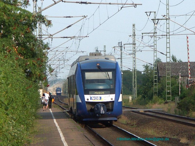 Bf Jübek im Juli 2009 - Die NOB nach Husum fährt gerade ab, im Hintergrund noch der vorher von dort gekommene Tw nach Kiel....