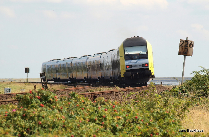 Nachschuss auf die NOB 80519 Westerland/Sylt - Hamburg-Altona, geschoben von ER 20-012, bei der Auffahrt auf den Hindenburgdamm, westlich von Morsum. Aufgenommen am 6.08.09.
