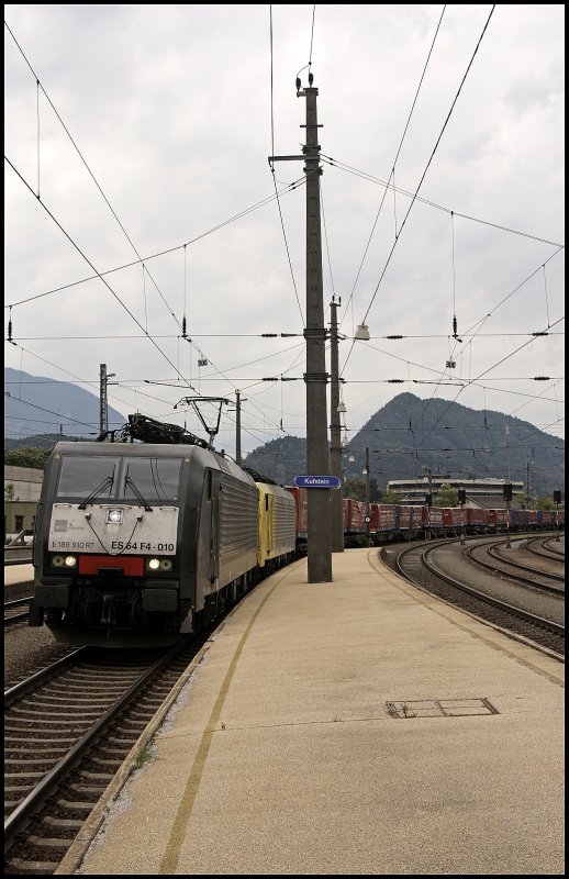 E189 905RT (9480 0189 905-3) und E189 923RT (9480 0189 923-6) verlassen mit der ES64U2-028, am Zugschluss, den Bahnhof Kufstein in Richtung Brenner mit dem DGS 43139 am Haken. (31.07.2009)