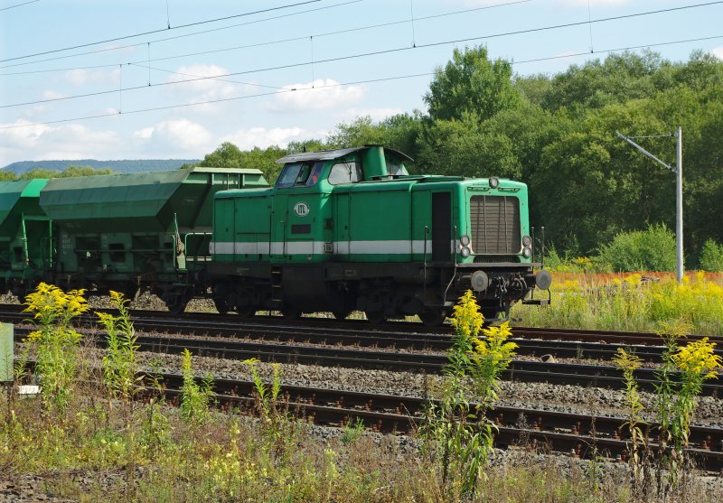 Der letzte ITL Schotterzug für den neuen Stadtbahnhof Eschwege am 18.08.2009. Zuglok wieder 152 901-5 (ES 64 F-901). Hier im Bahnhof Eschwege West.