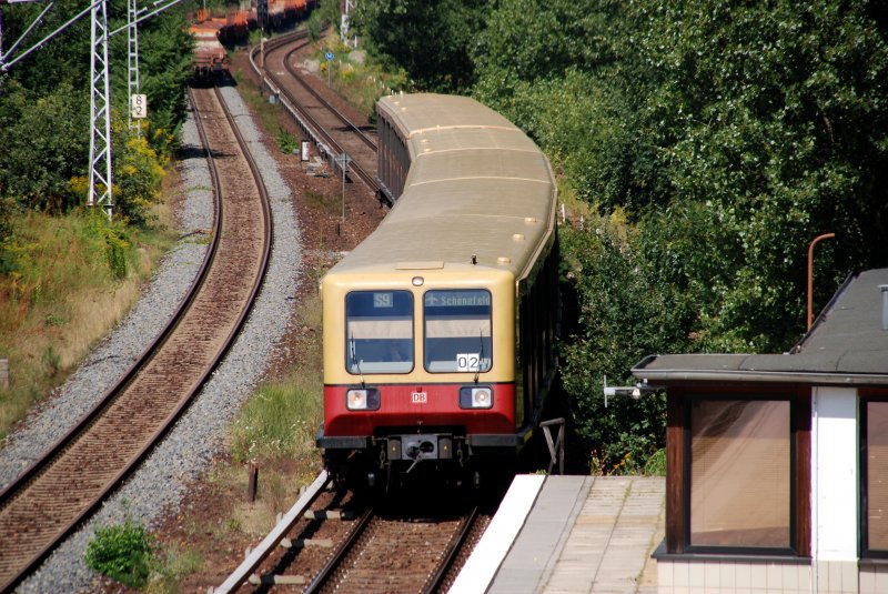 BERLIN, 16.08.2009, S47 nach Schöneweide bei der Einfahrt in den Bahnhof Schöneweide -- fotografiert von der Brücke über dem S-Bahnhof Betriebsbahnhof Schöneweide