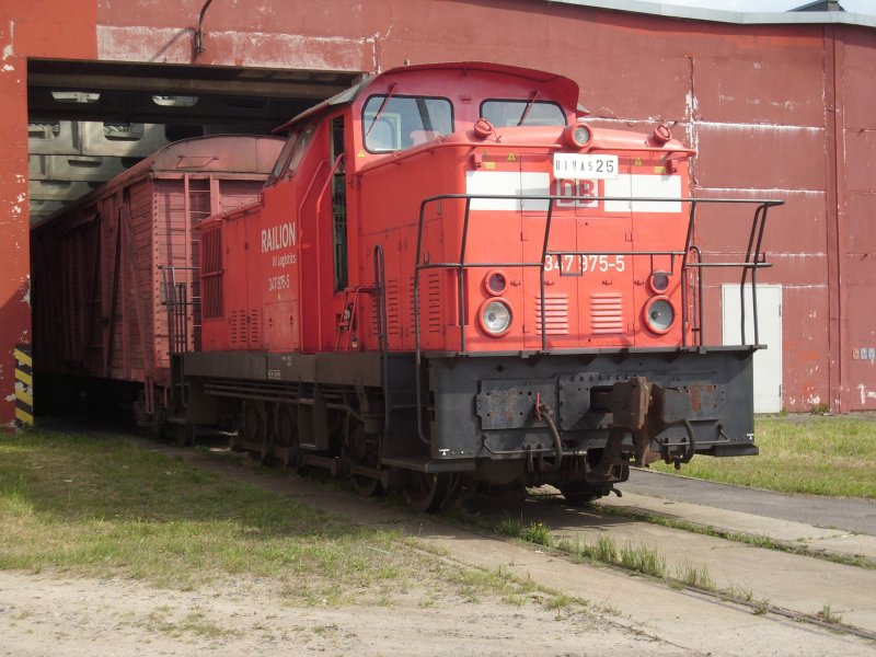 Breitspurdiesellok 347 975 zog am 17.August 2009 russische Breitspurgüterwagen aus der Umladehalle in Mukran.