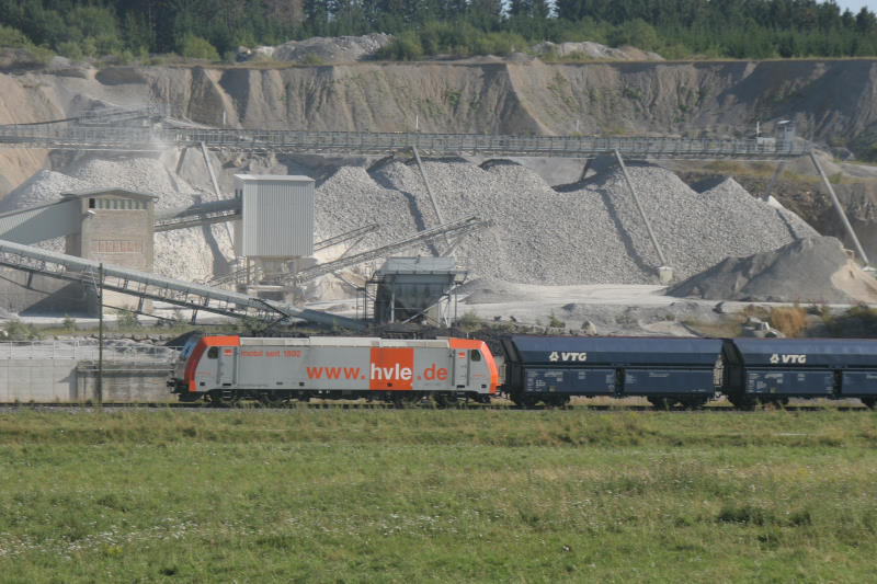 185 641 mit einem Kalkschotterzug vor der Ofengruppe vom Kalkwerk Hornberg; 19.08.2009