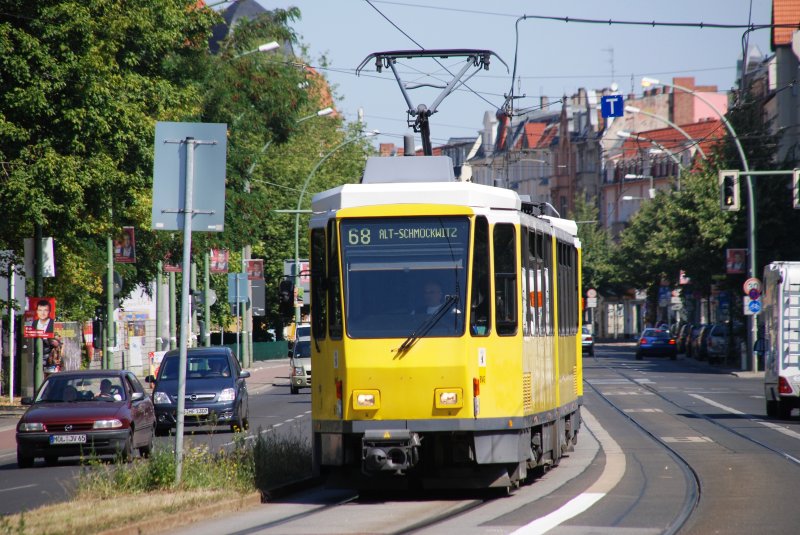 BERLIN, 16.08.2009, Tram68 nach Alt-Schmöckwitz bei der Einfahrt in die Straßenbahnhaltestelle Bahnhofstraße/Lindenstraße in Köpenick