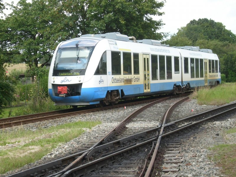 Einen Tag zuvor am 17.August 2009 erwischte ich den Stammtriebwagen 701 noch bei der Einfahrt in den Bahnhof Putbus.Im Vordergrund die Normal/Schmalspurbahnkreuzung.