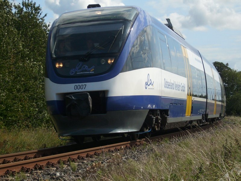 Für den Stammtriebwagen 701 kam am 18.August 2009 OLA-Triebwagn 0007 zwischen Bergen/Rügen und Lauterbach Mole zum Einsatz.In der Nähe vom Einfahrsignal Bergen/Rügen fotografierte ich den Triebwagen als Dieser von Lauterbach Mole kam.