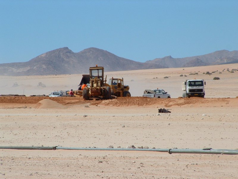 Auf der Südbahn nach Lüderitz geht es hoch her! An manchen Orten wird am neuen Bahndamm für die neu zu verlegenden Schienen gebaut. Dies geschieht im offenen (Wüsten-)Gelände nach Strassenbaunormen. Nichts geht ohne Wasser! Im Vordergrund eine Pipeline, die das kostbare Nass zu denn einzelnen Bauabschnitten leitet.