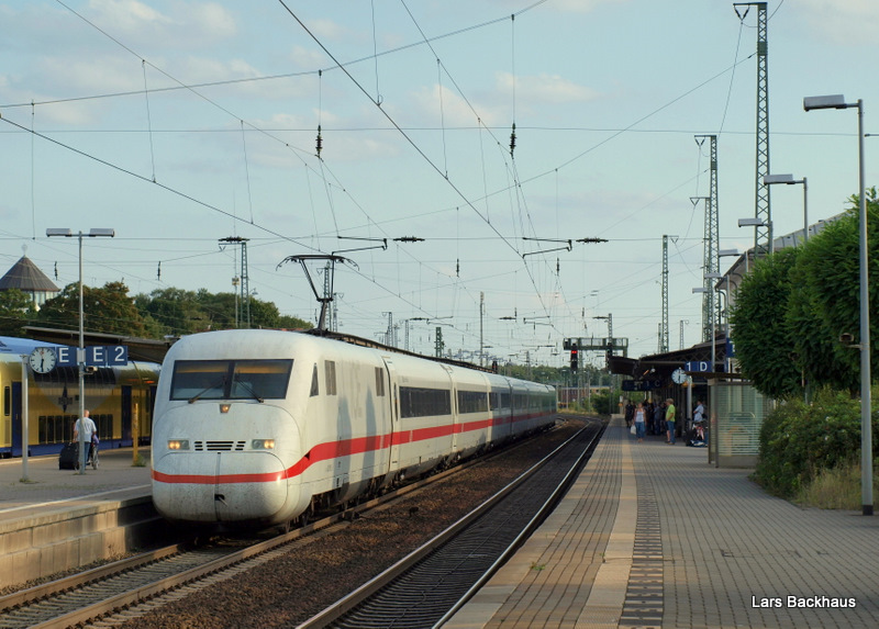 Blick auf den ICE 885 Hamburg-Altona - München Hbf, der sich am 16.08.09 an der Nordausfahrt des Lüneburger Bahnhofes in eine Linkskurve legt.