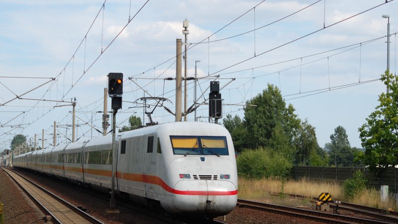 ICE 849/859 rauscht am 6.8.2009 kurz hinter Dollbergen dem Ziel, Berlin, entgegen. Der hintere Triebzug ist Tz 206 "Magdeburg".