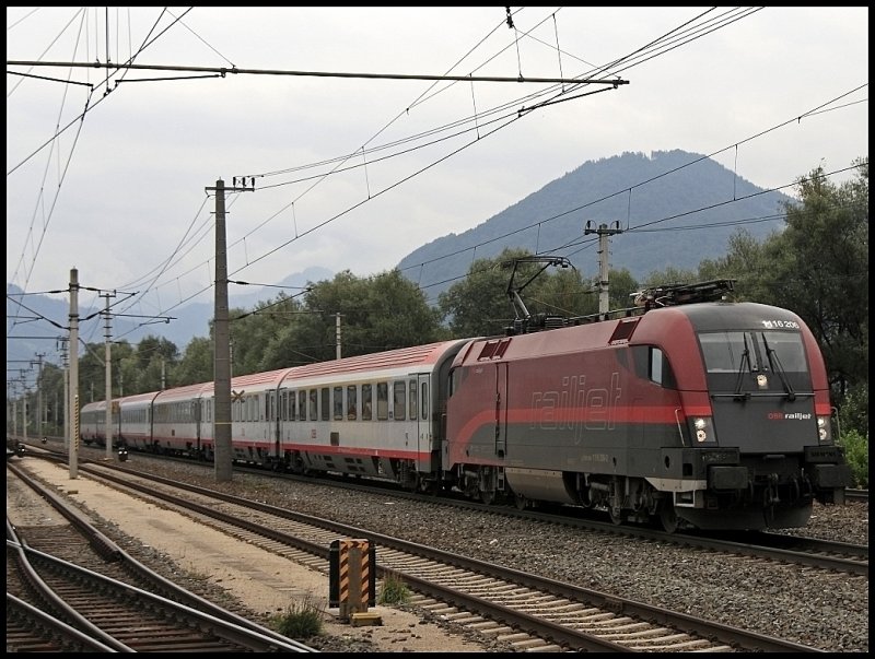 Gemeinsam ziehen die 1116 191-6 und die Railjet 1116 221-1 einen 16-teiligen Personenzug durch die Bahnhaltestelle Rekawinkel. (21.08.09)
