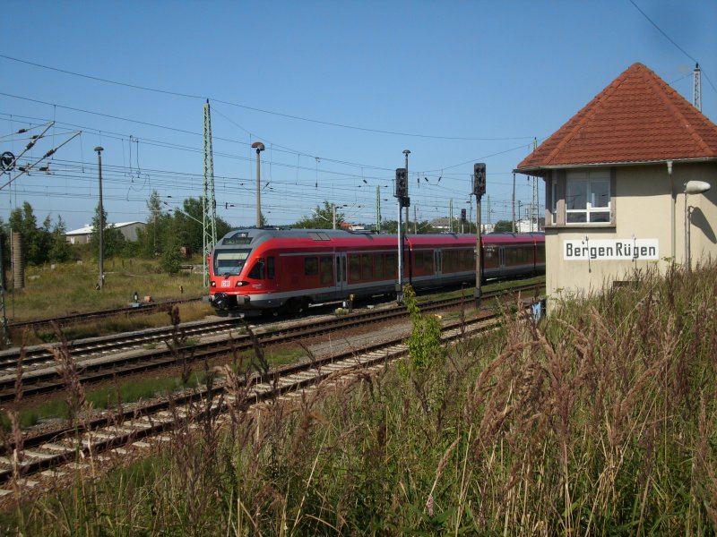 Flirt 429 fährt am 05.August 2009 am Weichenwärterstellwerk W1 aus den Bahnhof Bergen/Rügen.
