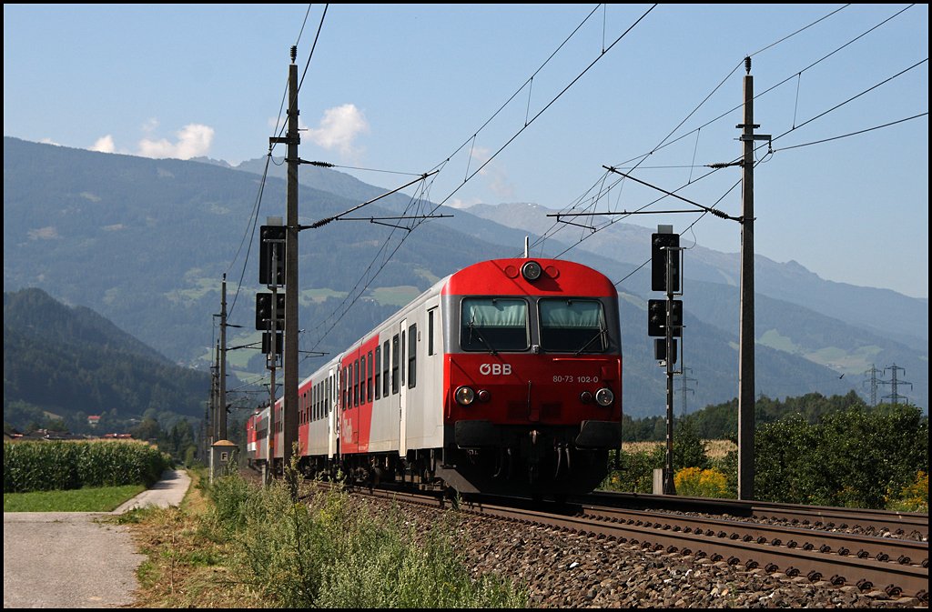 Ein richtiger Regionalzug… Steuerwagen vorraus 80-73 102 ist REX 1509 "betriebliche-altersvorsorge.at", Innsbruck Hbf - Schwarzach-St.Veit, bei Schwaz unterwegs. (07.08.2009)