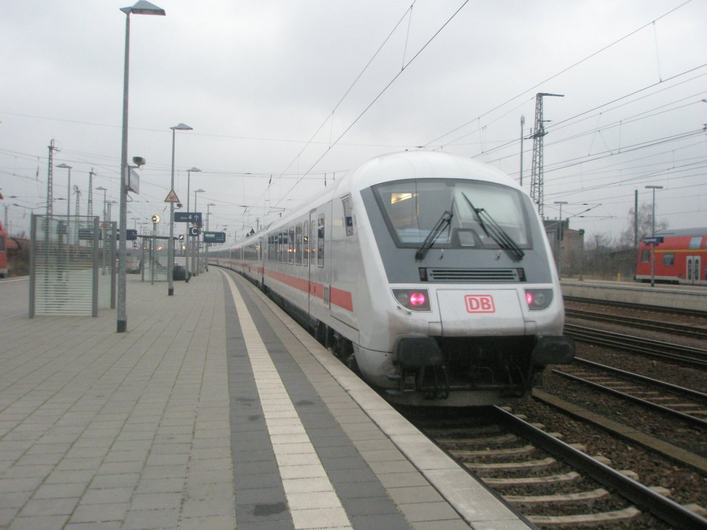 Hier ein IC nach Ostseebad Binz, bei der Ausfahrt am 10.12.2009 aus Angermünde.