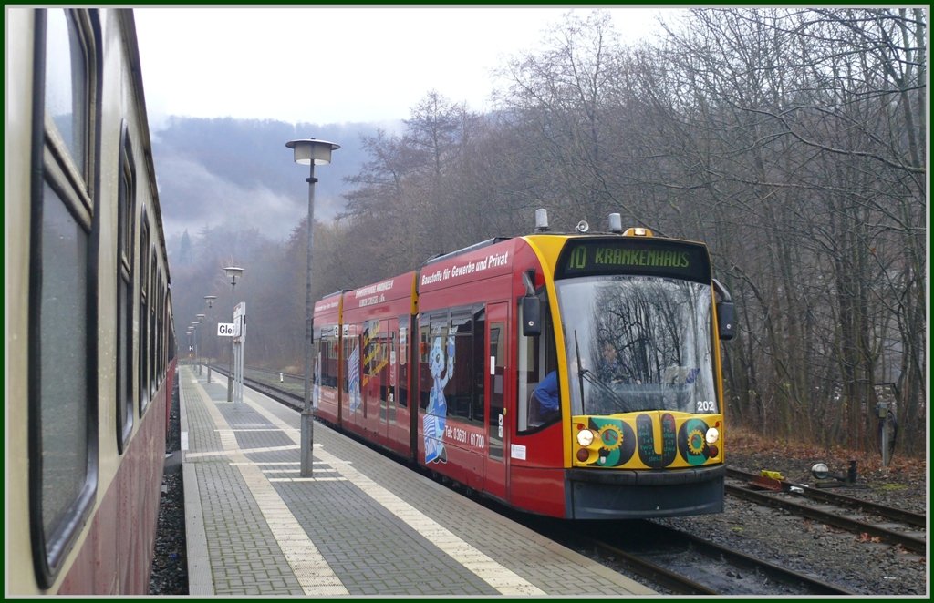 Nordhäuser Tram 202 auf den Geleisen der HSB in Illfeld. (06.12.2009)