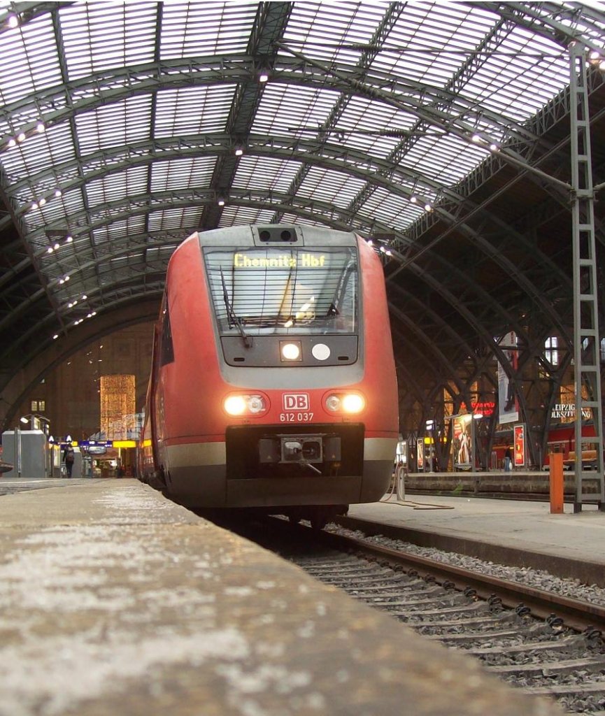 612 037 steht im Hbf Leipzig zur abfahrt bereit nach Chemnitz Hbf 10.12.2009