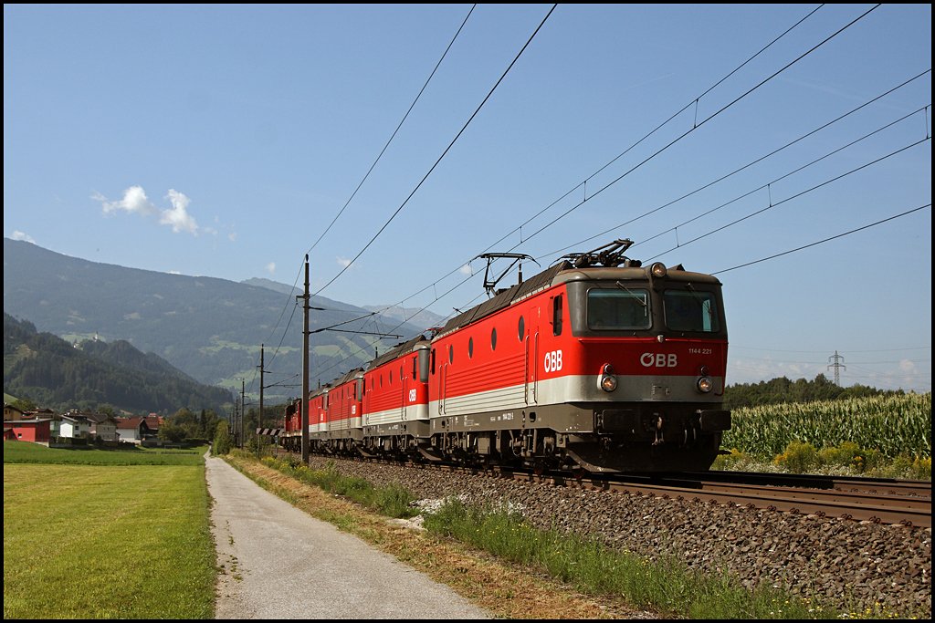 Alpenheuler-POWER: 1144 221 (9181 1144 221-9) bringt und zwei 1063er von Innsbruck nach Wörgl, wo sie für die nächsten Vorspann- oder Nachschiebeeinsätze verwendet werden können. (07.08.2009)