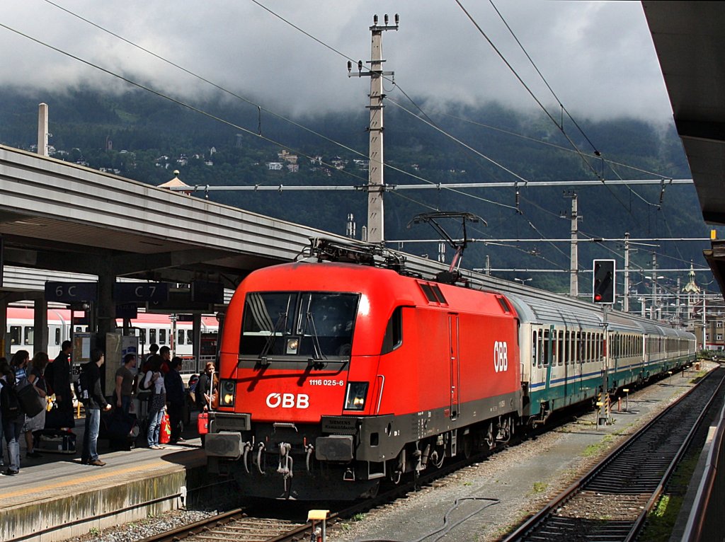Die 1116 025 am 11.06.2009 mit einem Italienischen EC bei der Einfahrt in den Innsbrucker Hbf.