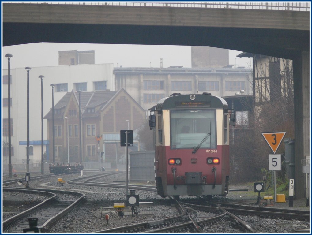 HSB 187 016-1 rangiert in Nordhausen und das bei nebligem, unfreundlichem Nieselregenwetter. (06.12.2009)