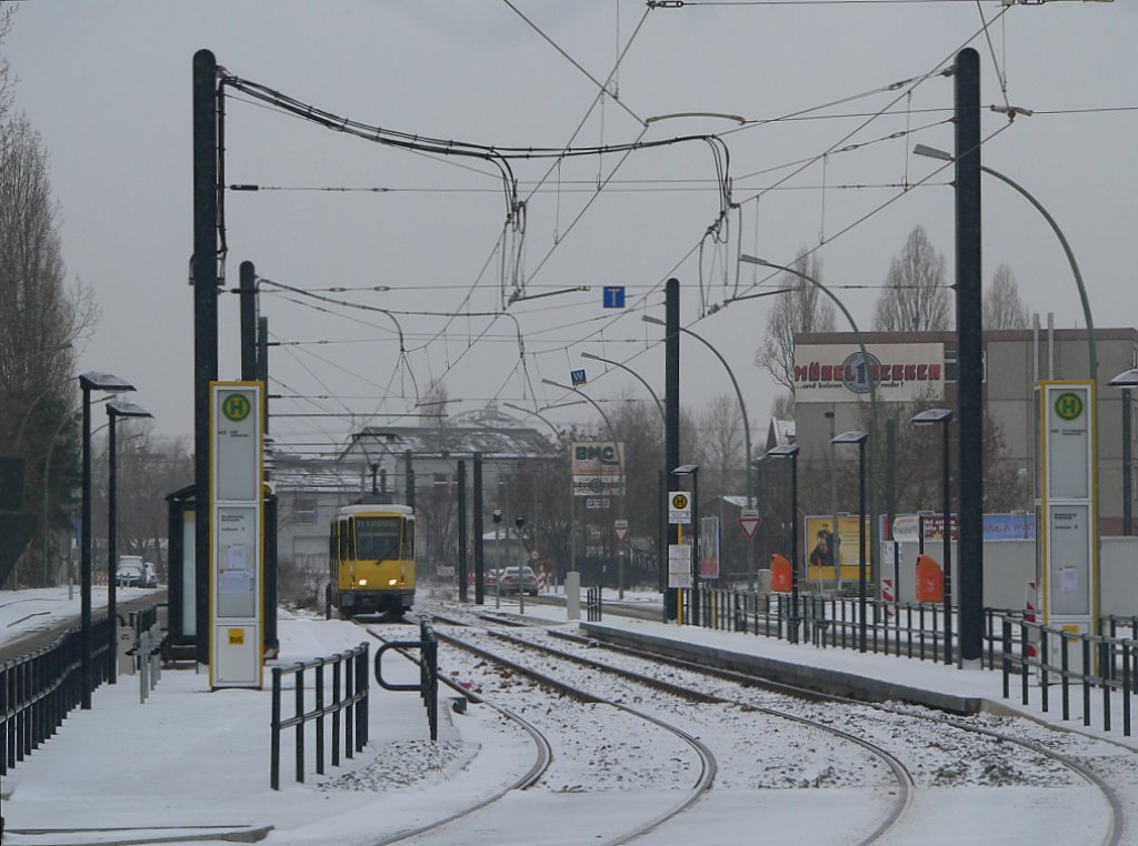 Zuverlässig - auf die Minute pünktlich passiert diese Tram der Linie 21 - Fahrzeug 7053 der BVG - die ehemalige Haltestelle Blockdammweg/Ehrlichstraße. 18.12.2009