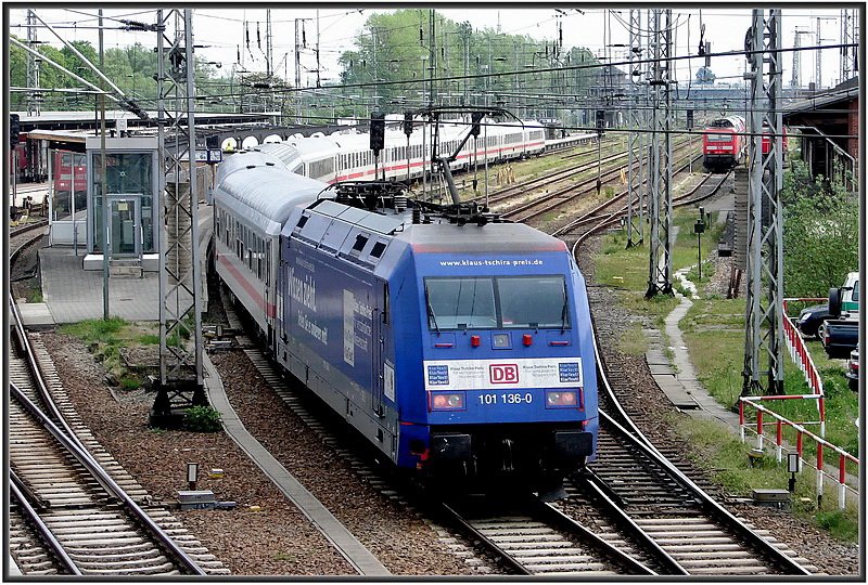 16.05.2007 - 101 136-0 damals noch mit "Wissen zieht.." Beklebung(vor IC2212 aus Koblenz), bei Einfahrt in den Hbf Stralsund.