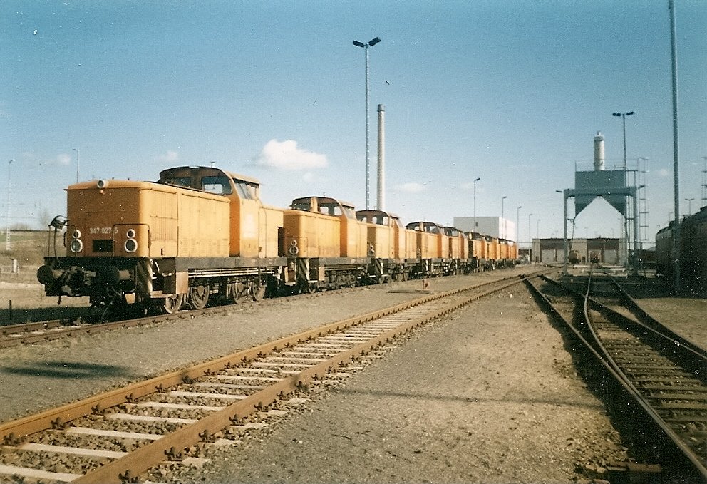 Neun arbeitslose Breitspur 347er standen im März 1998 in Mukran.Heute sind nur noch sechs Loks in Mukran davon sind nur drei Loks betriebsfähig.