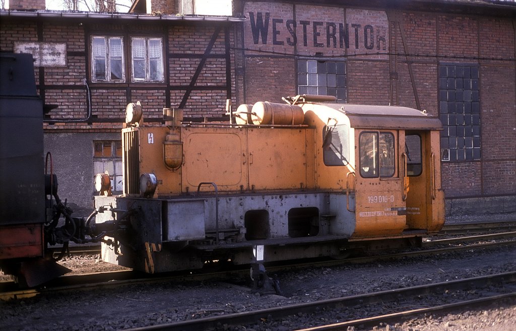 Eine Diesellok der Neusser Eisenbahn bringt einen Kalksilozug in eines der