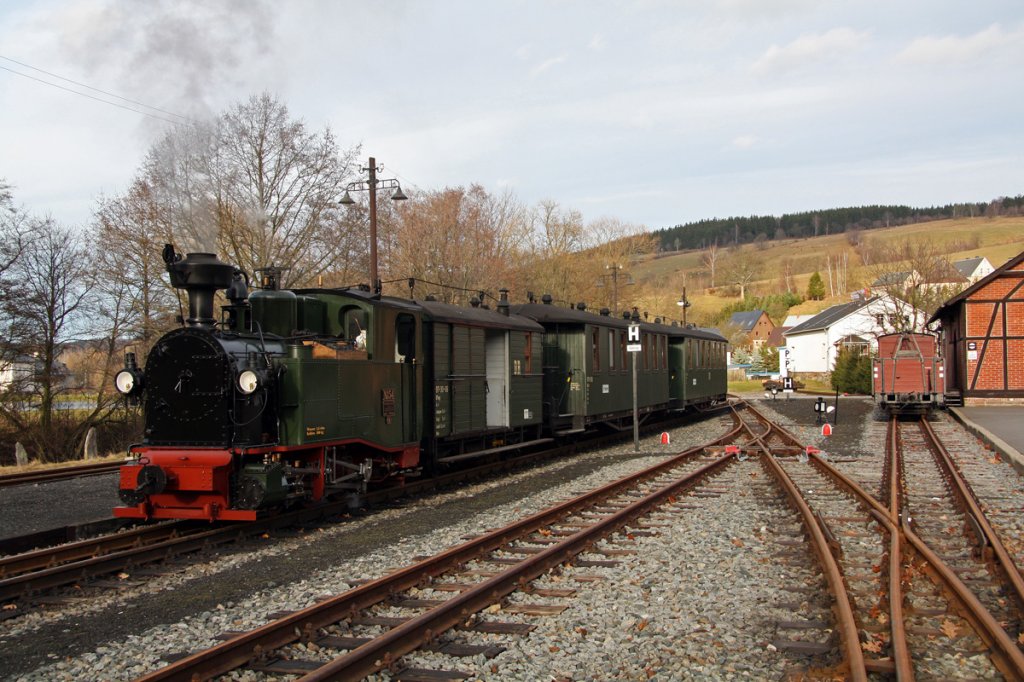 Kleine Lok mit großer Dampfwolke! Wenn auch der Schnee noch fehlte, waren die Fahrten am ersten Adventswochenende bei der Preßnitztalbahn ein Erlebnis. Hier verläßt die I K unter Volldampf den Bahnhof Steinbach in Richtung Jöhstadt.