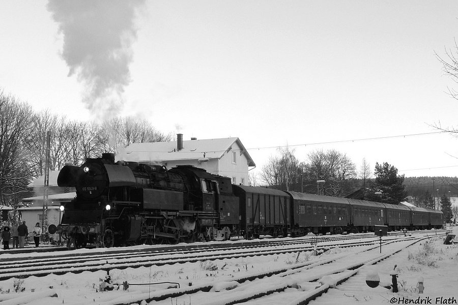 Am 20.12.09 passiert 65 1049 mit ihren Leerzug nach Crahnzahl den Haltepunkt Sehma. Leider verschwindet die Kirche hinter der Dampffahne.