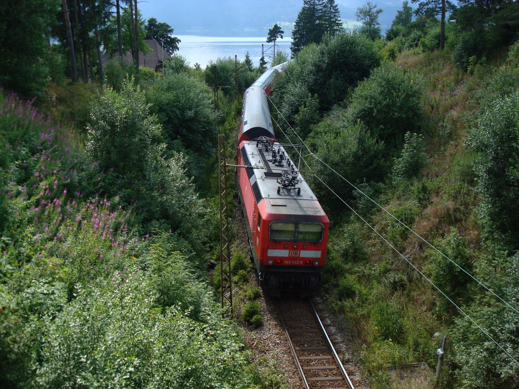 Doppelstock-Wendezug mit E-Lok 143 042-0, kurz vor dem Endbahnhof Seebrugg am Schluchsee/Schwarzwald, die erfolgreiche DDR-E-Lok ist in Freiburg stationiert und befährt die starken Steigungen des Höllentales, Juli 2008