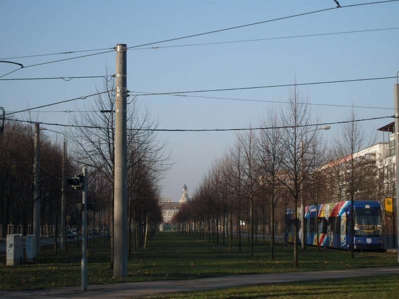 Die Bahn is bissl klein auf dem Bild, aber dafür erkennt man die großzügig angelegte Straßenbahntrasse, mit Blick auf die Frauenkirche in der Mitte.