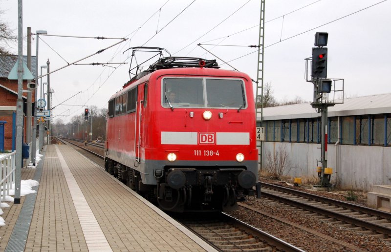 111 138 vom Bw Braunschweig durchfährt am 30.01.09 den Bahnhof Burgkemnitz in Richtung Berlin. Ein seltener Gast!
