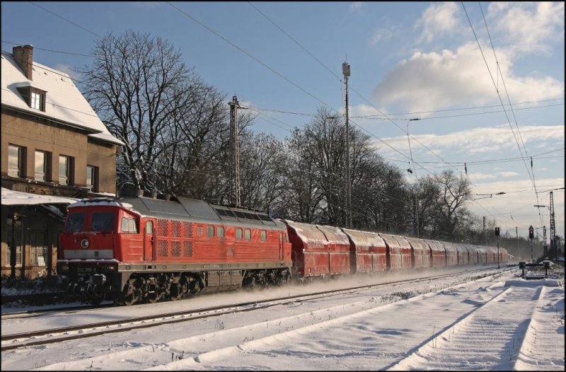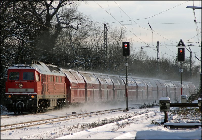 232 388 ist mit einem Kalkzug von Rodenhaus nach Duisburg unterwegs. (05.01.2009)