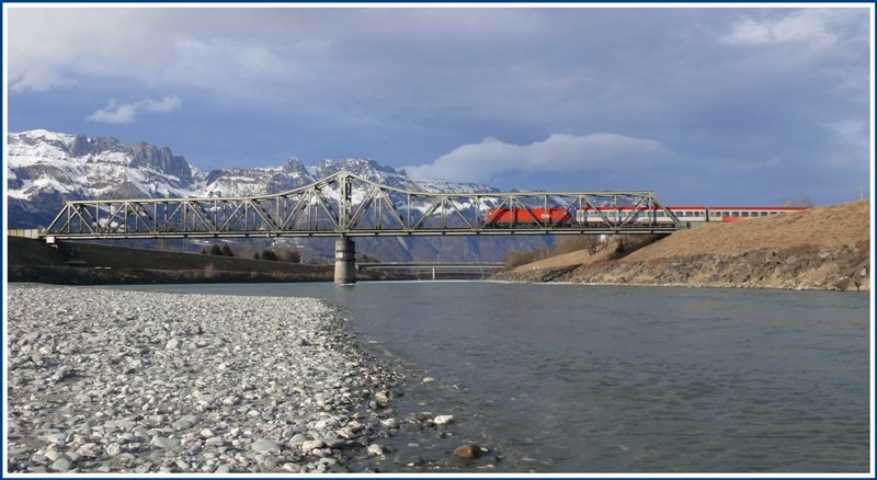 Dank des Föhns herrschte eine phantastische Stimmung über dem Alpstein und am Rhein bei Buchs SG, als ich den leicht verspäteten EC 160 beim Grenzübertritt erwischte. (02.02.2009)
