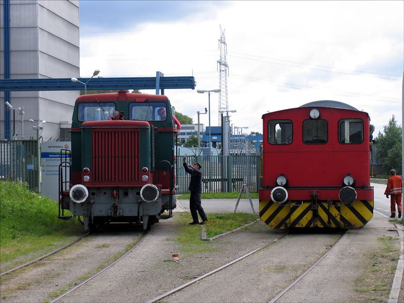 Die Diesellok V 2, gebaut 1957 von Klöckner-Humboldt-Deutz, Fabriknummer 56744, hat ihre Rangieraufgaben erledigt und nach Umstellen der Handweiche kann die ex Krefelder Mak Stangenlok den Museumszug der Arbeitsgemeinschaft Geesthachter Eisenbahn zur Rückfahrt nach Bergedorf-Süd übernehmen; Krümmel, 14.09.2008