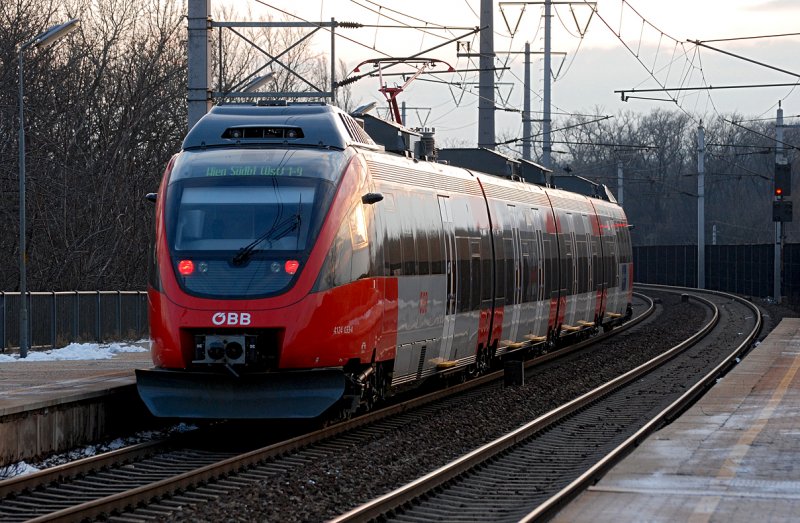 4124 033 unterwegs als Schnellbahnzug 25073 von Wien Hausfeldstraße nach Wien Südbahnhof (Ostseite) am 19.02.20009 im Abendlicht. Das Foto wurde am Praterkai aufgenommen.