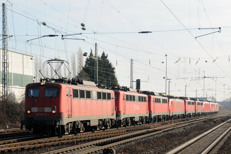 Auf diesem Bild sind 6 BR140 und eine BR139 aufgebügelt sichtbar, aufgenommen im schneienden Aachen West am 19.02.2009