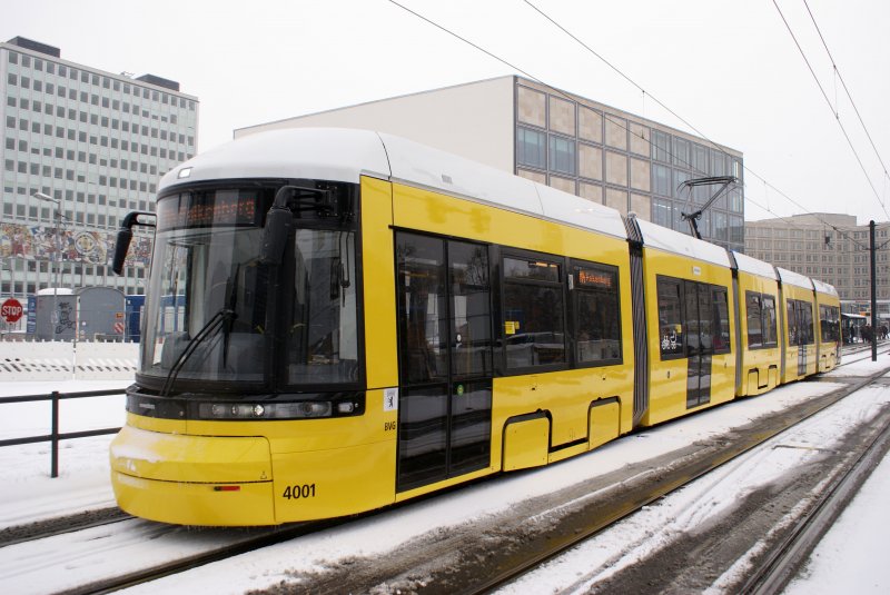 Typ GT8-08 ZRK ( Wagen 4001 )Kurze Zweirichtungsausführung der neuen Berliner Tram Flexity. Hat auf beiden Seiten 4 Türen. Wagen 8001 und 9001 sind länger und haben 5 Türen. Berlin Alexanderplatz 19.02.2009 http://www.berlin-straba.de/