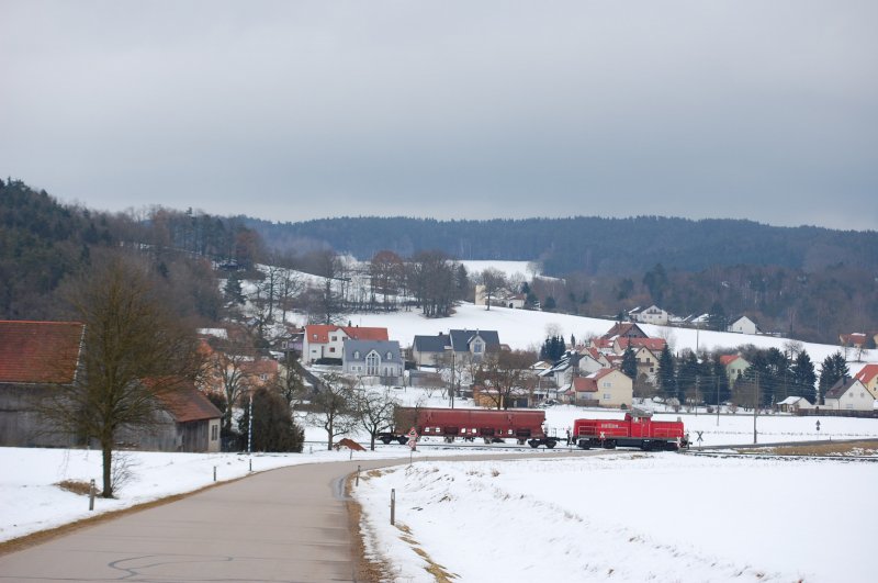 Ab 14:05 wird zurückgewunken! 294 587 mit Güterzug in Amberg-Neumühle mit Winkendem Besen!!! (24.02.2009 Strecke Amberg-Schnaittenbach) Ein Gruß an den Lrf!