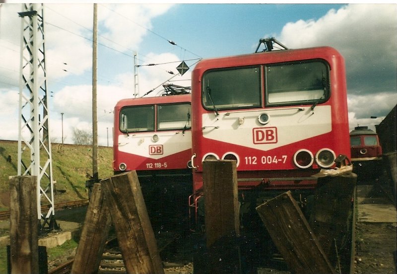 Auf neue Aufgaben warteten,in der Einsatzstelle Berlin Lichtenberg,im März 1998 112 118 (links) und 112 004 (rechts).