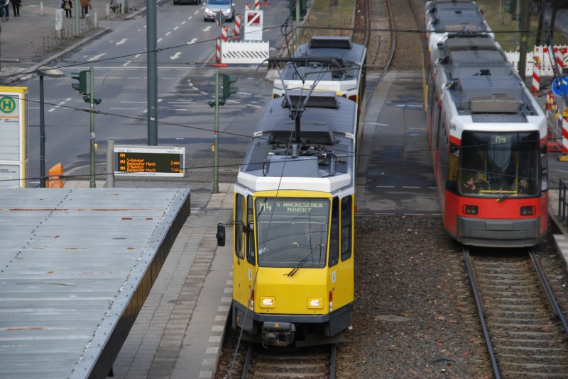 BERLIN, 27.02.2009, MetroTram M4 (links in Richtung Alexanderplatz, rechts in Richtung Prerower Platz) an der Haltestelle S-Bahnhof Greifswalder Straße