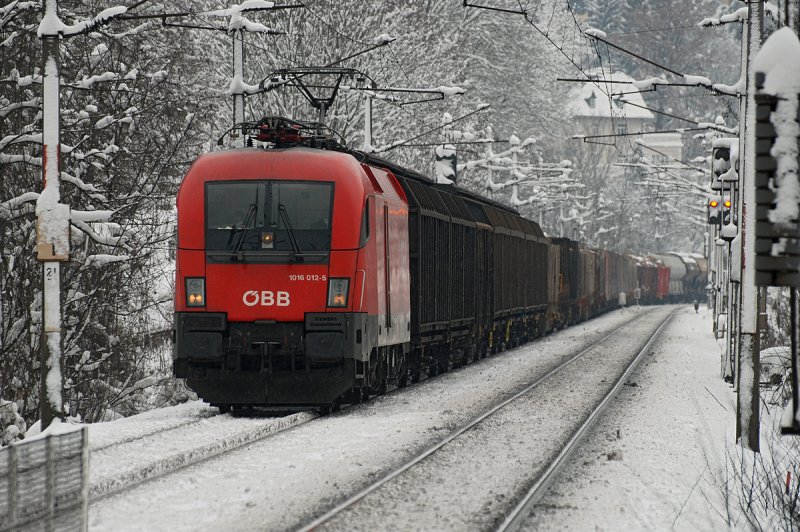 1016 012 vor einem Güterzug kurz vor Pressbaum. Winterlicher Wienerwald, am 31.01.2009.
