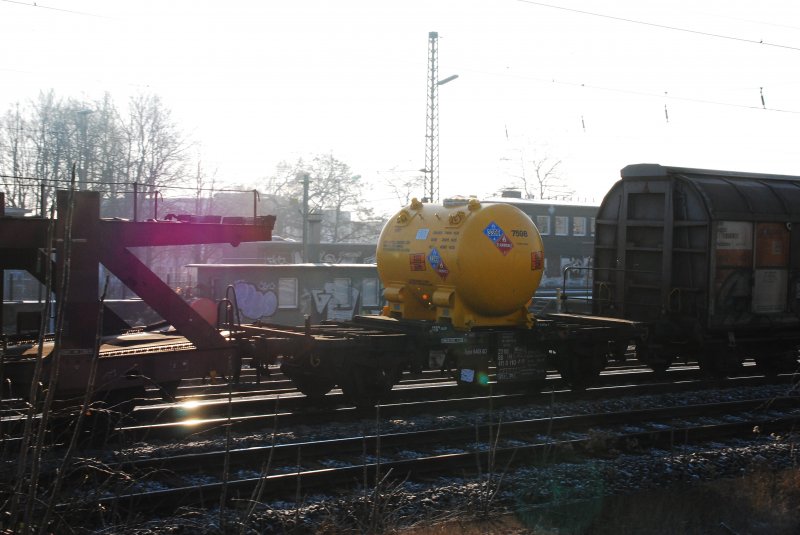 Dieser putzige Kesselwagen kam mir am 31.12.2008 in der Mittagszeit vor die Linse. Auffällig war, das der gesamte Zug fast nur aus großem Wagenmaterial bestand und nur dieser wirklich auffiel. Habe keine Ahnung was hier transportiert wird. Ich meine nur einen Hinweis auf feuergefährliche Stoffe erkannt zu haben. Wer weiß was das für "einer" ist, bitte mailen.