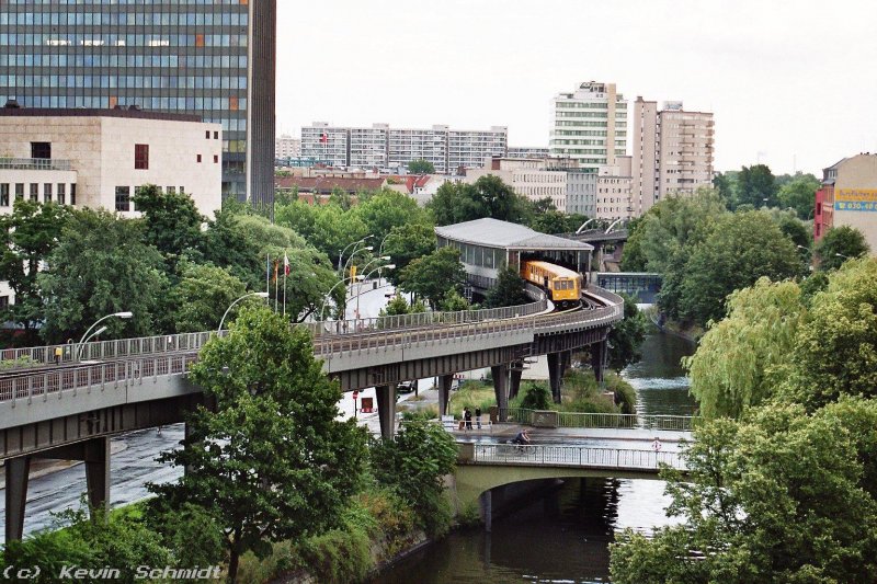 Eine Zug der Berliner U-Bahn verlässt den Bahnhof Möckernbrücke. (August 2005)