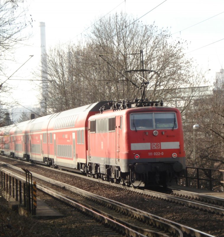 111 022-0 schiebt am 05.02.09 ihren RE aus Salzburg nach München über die Eisenbahnüberführung am Münchner Kolumbusplatz.
