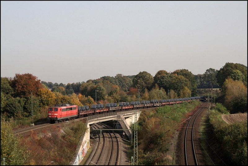 151 081 schleicht mit einem schweren Coilzug bei Kreuzungsbauwerk Abzw Stockumer Straße in Richtung Hagen. Ziel des Zuges ist Kreuztal. (13.10.2008)