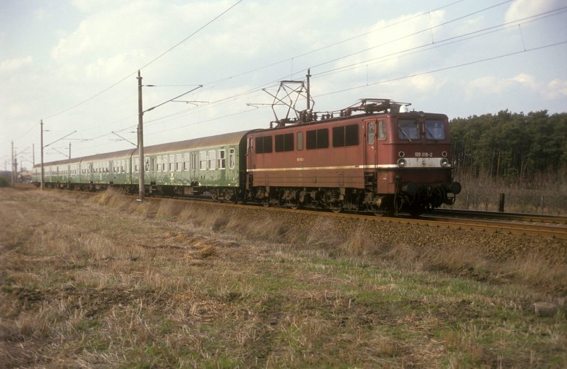 Als die SBB Re 460 neu war, hatte sie so ihre Macken, die bisher bei den vorhergehenden Baureihen mit einem gezielten Hammerschlag repariert werden konnten. Als dann ein IC bei Palèzieux stecken blieb und von einer Ae 4/7 abgeschleppt werden musste, wurde die Re 460 strafversetzt: Wie zum Beispiel hier mit einem beschleunigten Personenzug (Leichtstahlwagen!) Lausanne - St-Maurice im März 1994.