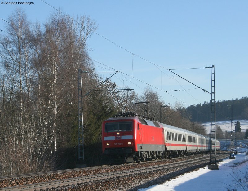 Bahntechnik mit Kompetenz 120 501-2 durcheilt mit einem Ersatz-ICE in gleißender Abendsonne den Bahnhof Neuoffingen. (KBS 980, Januar 2009).