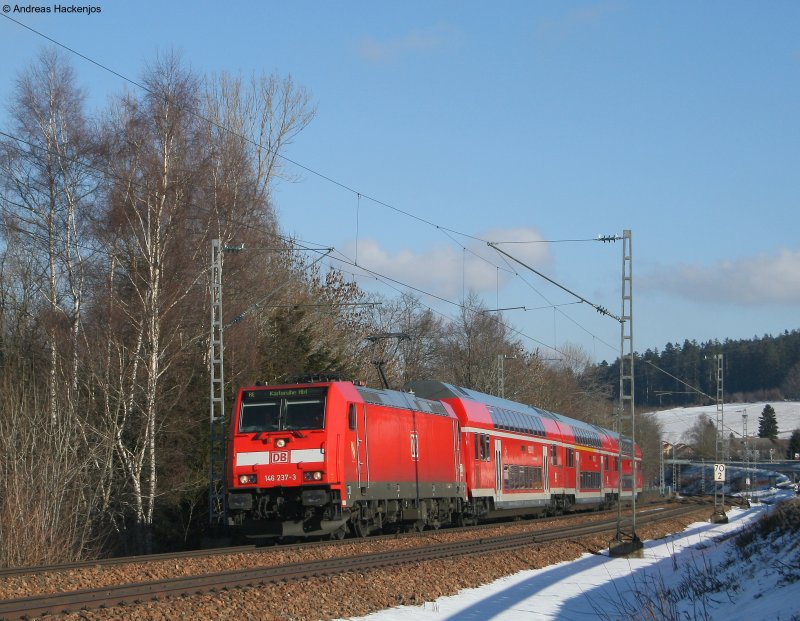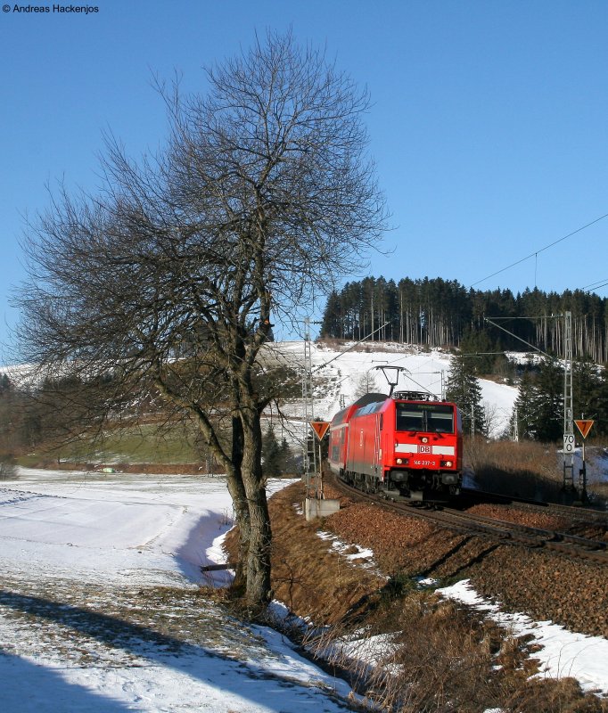 146 237-3 "Karlsruhe" mit dem RE 4712 (Konstanz-Karlsruhe Hbf) am km 70,0 25.1.09. Normalerweise würde man hier den Steuerwagen sehen da der Zug aber ohne Verkehrte kam es zu dieser seltenen Anblick