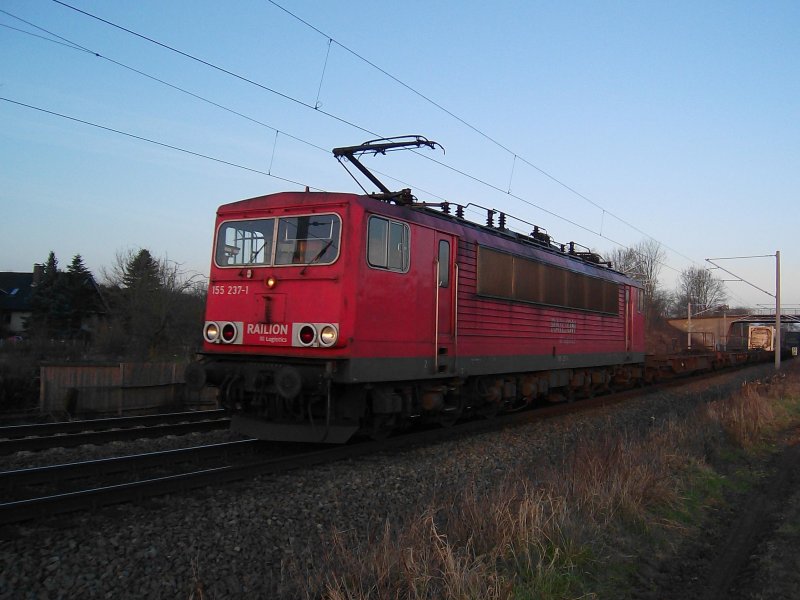 155 237-1 fährt am 25.01.09 gemächlich mit ihrem Containerzug bei Altenfelde im GWB um die Überholung von RE 21425 abzuwarten.