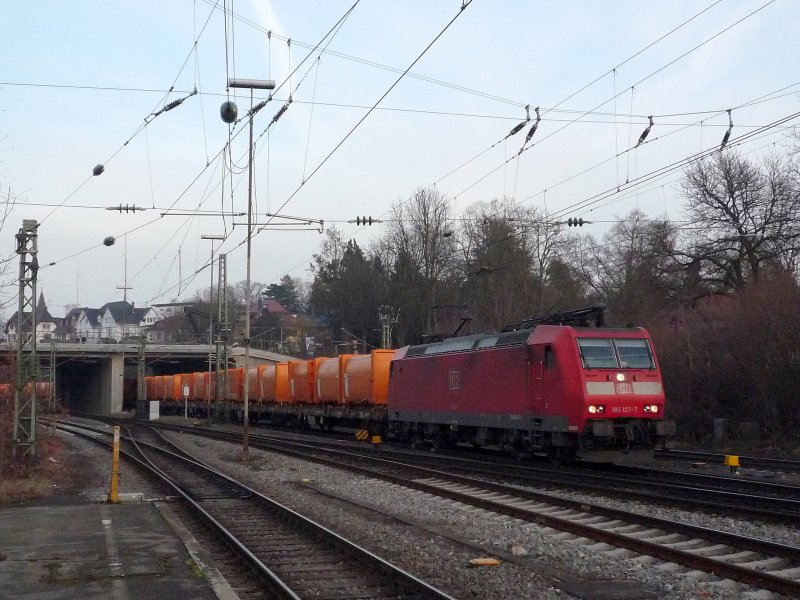 185 123-7 fährt mit dem CS 47088 Weinfelden(CH) - Singen am Hohentwiel durch Radolfzell. 26.01.09